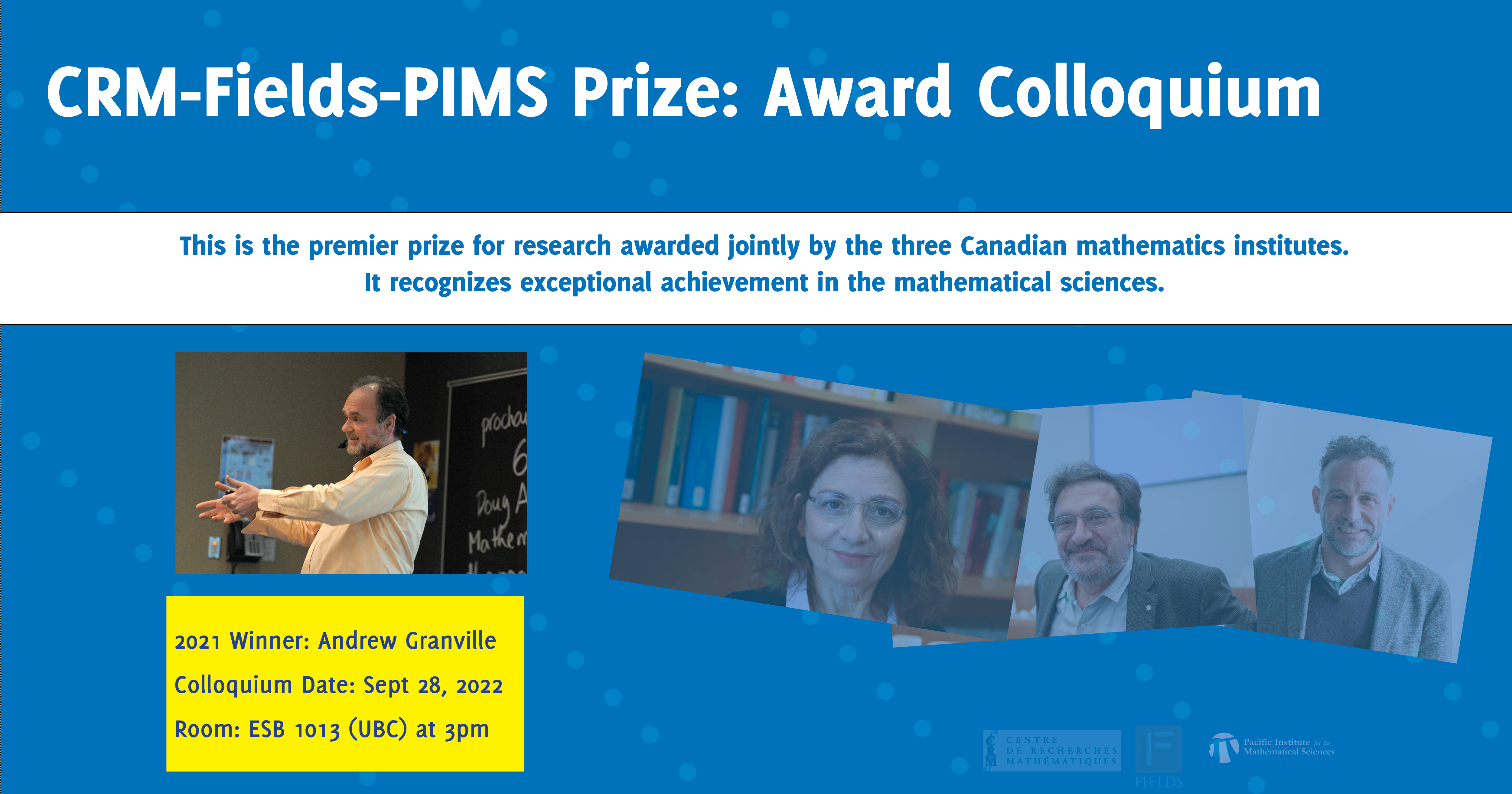 PIMS is excited to host the 2022 CRM-Fields-PIMS prize winner for an afternoon lecture. The 2021 winner, Andrew Granville, will be presenting at the University of British Columbia. The lecture will be online, allowing members from the PIMS community to participate remotely. For those at UBC, the lecture will be streamed in ESB 4133.