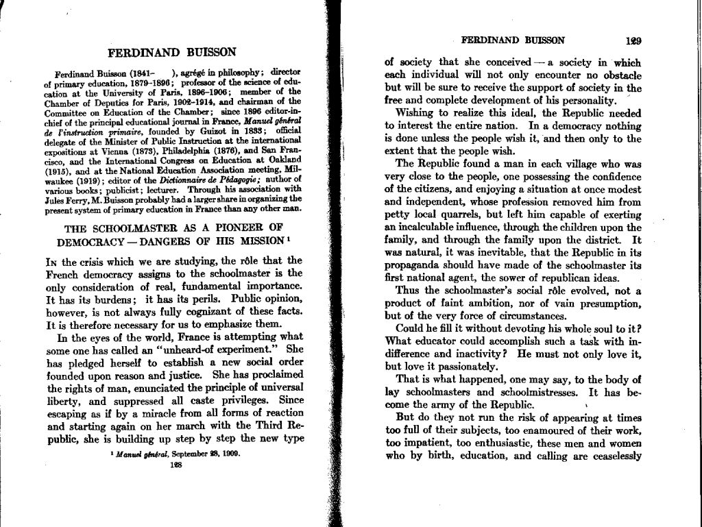 The book by Buisson and Farrington from which these pages are copied did, alas, not contain much by the first author himself. The following excerpt just shows that "citizenship" was already part of school.