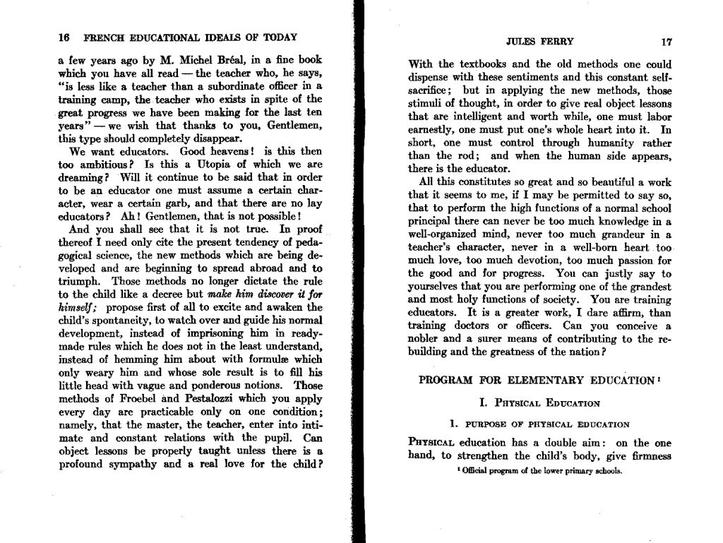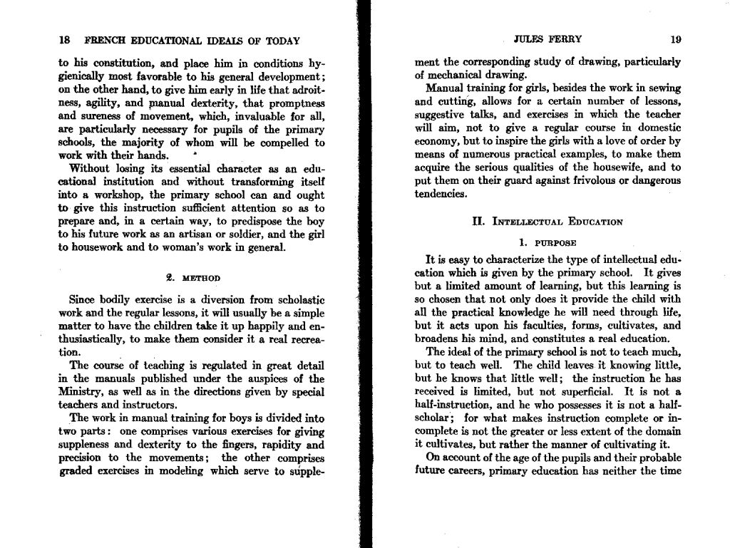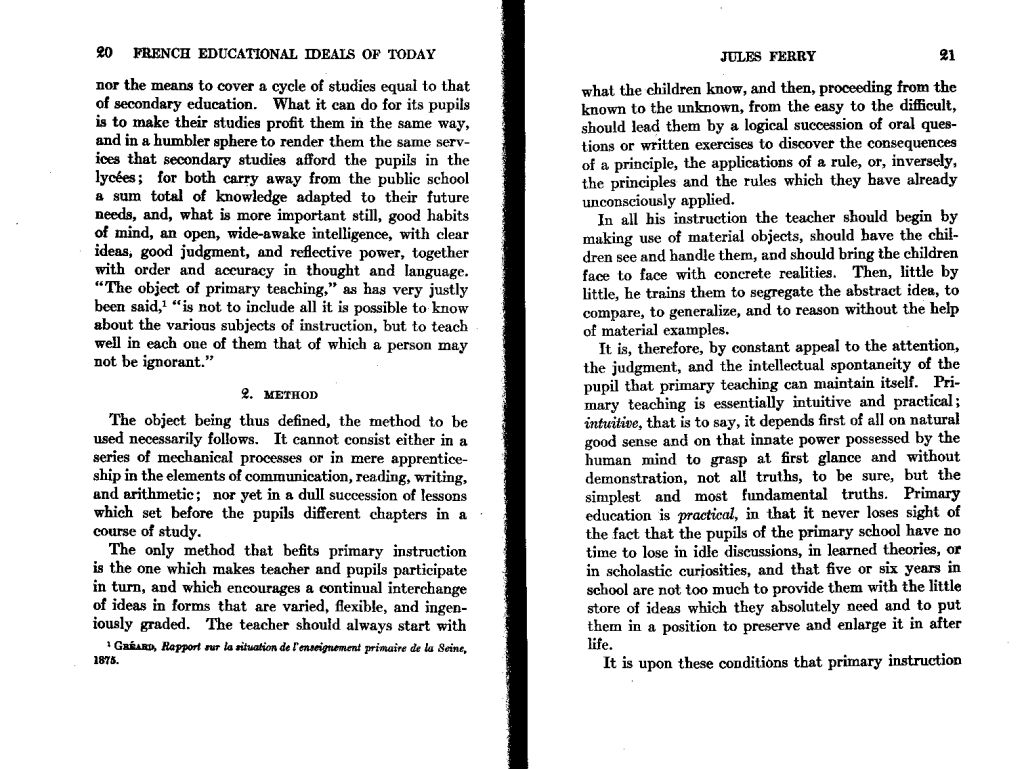 The penultimate paragraph on page 19 should be learnt by heart. But we can erase "primary" and replace "child" by "graduate". This is Ferry the instructor, on page 20 (second half) we meet the pedagogue.