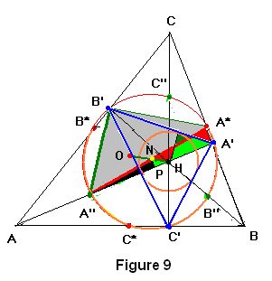 Since the two stages of creating P* from P -- namely the 180 degree turn as well as the shrinkage by 1/2 -- both preserve angles (why?), the whole transition from some planar struture to its Euler image is conformal (i.e., angle-preserving). In particular, the altitudes of A*B*C* are the Euler images of the altitudes of ABC, and their intersection O must be H* . Thus O and H lie on either side of G on a single line, the latter twice as far from G as the former. Since the wondrous circle K* is the Euler image of the circumcircle K, its centre O* is the Euler image of O. Just like O itself, O* also gets a special label, namely N. Now we know four points of the Euler line: O, G, N, H in that order. As the segment OG, which is 1/3 of OH, must be 2/3 of OO*=ON, the latter must be 1/2 of OH. In other words,