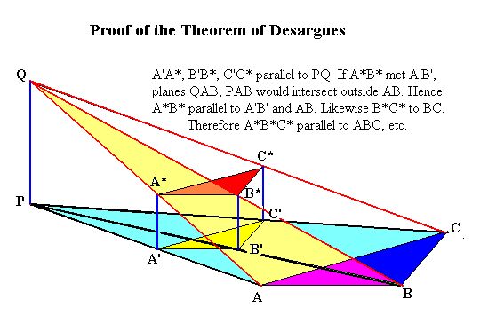 The lines AA', BB', CC' lie in a plane and meet in a point P. The segments AB, A'B' and BC, B'C' are pairwise parallel. How does it then follow that AC and A'C' are also parallel? The answer comes from space. Lifting P to some point Q outside the plane (say, vertically), one then constructs a triangle lying above A'B'C' by intersecting planes containing Q and appropriate sides of ABC. The proof is sketched on the diagram, and a more detailed argument is available here as a PDF-file. |