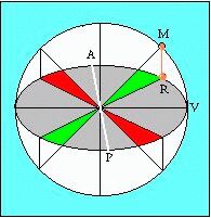 The diagram depicts the plane through the earth's equator. M is the ficticious "mean sun" uniformly circling counter clockwise. The darker ellipse is the projection onto this plane of the actual slanted orbit of the sun, and R is the real sun thus projected. Even if the sun's movement were perfectly uniform and circular, it would look something like this. Obviously the viewing angles differ -- agreeing only four times a year, and otherwise yielding different times on quartz watches and sundials. This basic pattern is complicated by two factors. Firstly, civil clocks start ticking on January 1, while solar ones begin at the vernal equinox V. Secondly, the sun's orbit is not quite circular, but slightly eccentric in the direction of the white line AP. The sun is closest at P (early January) and farthest at A (early July) -- but the difference is only 3.3%.