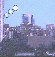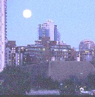 Full moon at equinox rising over Vancouver. At what time was the photo taken? Further down on this page, you'll get a chance to submit your answer. It involves some skillful guesswork: any answer that falls within 15 minutes of the actual time will be deemed correct. Recall that equinox refers to those special times when day and night are of equal length ("nox" means "night" in Latin). Note that Pacific Standard Time (PST) is about 12 minutes fast for astronomical observations in Vancouver, as this time zone begins about 3 degrees east of here. |