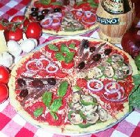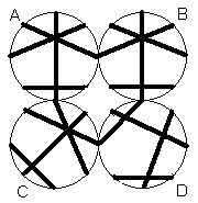 The present pizza problem is also about avoiding adjacent colours on a very simple "graph" (an octagon). Since every colour goes on exactly two slices, it can be looked at as studying the ways these slices can be paired up. The diagram on the left shows these pairings without colours. The four patterns represent the same "pizzas" which appear at the top right of this page -- and show more clearly why D does not belong to the same clan as the others. | ![]() |