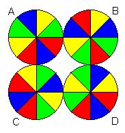 In that diagram, the "pizzas" A and B differ only by a permutation of the four colours. Since there are 24 such permutations, all our pizzas come in families of 24. The total number of possibilities -- ignoring the important condition that no two adjacent slices have the same topping -- is 105 times 24. Some mystery number, say P, of these 105 families will satisfy that condition. Both P and 24P will be accepted as correct answers. But in some sense, "pizza" C still belongs to the same clan as A, because it can be obtained from it by simple rotation. If you group the P families into such clans, you will get yet another number Q (of clans) which will also count as correct. The "pizza" D in the diagram is not in the same clan as A, B, and C. While every family has 24 members, the size of clans is variable.