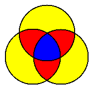The last of our diagrams is supplied to help the curious reader understand (for p=3) the somewhat formal description of the inclusion-exclusion principle given in the link above. It is not necessary for this problem, but might be useful in certain approaches: if you want to count the total in three overlapping sets, you can first add them all up, but then you must throw out the stuff in the twofold overlaps (it has been counted repeatedly), and finally add the threefold overlap back in again (it has been thrown out repeatedly).