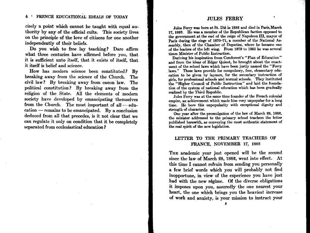When Jules Ferry launched the public school system of the Third Republic, he could do so with fresh ideas anchored in well-founded knowledge. The partial text on the left of the following JPEG is by Edgar Quinet, one of the early French thinkers on this subject (and, by the way, translator of Herder).