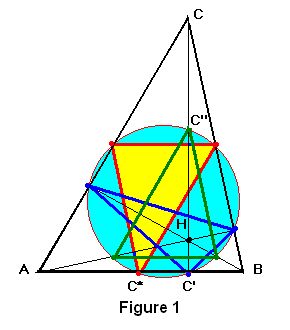 A'B'C', and A''B''C'', the first of these being formed by the midpoints of the sides, the second by the feet of the altitudes, and the third by the points midway between the vertices and the so-called orthocentre H of ABC.