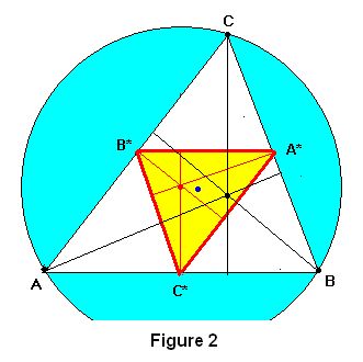 The blue dot which shows up between O and H in Figure 2 is called the centroid of ABC and usually denoted by G for "gravity". It is where you would stick a pin through a cardboard triangle to make it spin freely. We shall not call on Archimedes to explain this (though you may do so), but instead define G wihout reference to it as the common meeting point of the three medians AA*, BB*, CC*. A careful study of Figure 3 will convince you that they do indeed meet in a single point -- which cuts each median in the ratio 2:1, and is also the centroid of the smaller triangle A*B*C*. We shall presently see that G lies on OH, which -- though only a segment -- is known as the Euler line of ABC. In fact, the collinearity of OGH is one of the by-products of an article written by Euler in 1765.