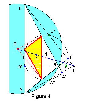 Everything said so far would apply verbatim to triangles with an obtuse angle. Indeed, if you can look past the the confusing lines and letters of Figure 4, you will see a triangle ABC with an obtuse angle at B. Now the feet of the altitudes from A and C lie on the extensions of the sides BC and CA, respectively, and the orthocentre H lies outside the bluish halo of the circumcircle. This makes for a nice and long Euler line OH, on which G and N are clearly visible. For a first time through, you should probably skip Figure 4 and the text that goes with it. All it does is justify what is stated under "Upshot" a couple of paragraphs further down, namely that obtuse angles can be circumvented. It looks messy but it is only a question of sorting things out -- no tricky thinking -- you can can come back to it later.