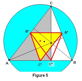 To see that C' lies on K*, imagine the circumcircle (not shown in Figure 5) of the right triangle AC'C. Corollary (1) implies that AC is one of its diameters, whence B* is its centre and B*C' one of its radii. This makes B*C' congruent to B*A and hence to A*C* (see?). Corollary 2 now says that all vertices of the trapezoid A*B*C*C' lie on a single circle -- which can only be the circumcircle K* of A*B*C*. Analogous arguments, using different right triangles (which ones?), will pull B' and A' onto K*. |
