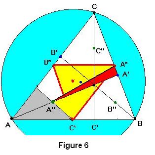 Figure 6 is meant to show why A'' lies on K*=K (this equation having been proved already). If you draw a parallel to BH through C*, you will create a triangle AC*A'' (gray) which is half the size, by linear measure, of the triangle ABH (since C* is the midpoint of AB). Being parallel to BH and hence to BB', the segment C*A'' is perpendicular to AC as well as to C*A*. In other words, A''C*A* is a right triangle with hypotenuse A''A* -- but so is the triangle A''A'A*, for even more obvious reasons. Corollary (1) says that A"A* is a diameter of the circumcircles of both A''C*A* and A''A'A*, which must therefore coincide. Now we have A'', C*, A', and A* on a single circle which can only be the circumcircle of C*A'A*, i.e.,