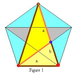 And the pentagram connection? Oh, if we knew that the base angle of the big yellowish triangle is equal to twice its vertex angle, the latter would be 1/5 of 180 degrees -- see? Now , a/b is very nearly equal to (a+b)/a -- which means that the lower pale yellow triangle is well-nigh isoscles, and the distance from the lower left red dot to the blue dot is nearly equal to a. Hence the upper deep yellow triangle is well-nigh isosceles, and its exterior angle at the blue dot is roughly twice the vertex angle -- Q.E.D. |