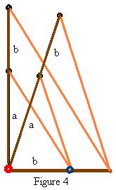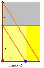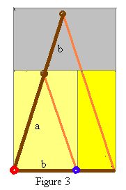 First the angles: since big and small have the same base angles, small fits snugly into the right lower corner of big. Then the sides: the one labelled "a" in Figure 3 was the side of the square in Figure 2, hence fits exactly along the base. So it works! But remember: now that we have moved into geometry, "a" and "b" are line segments not numbers.