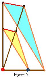 How perceptive of you -- and right you are: mechanics is not geometry. I promise to come back to those rubber bands. But first let us see how to get a pentagram from the triangle of Figure 3, supposing that the parallelitity holds up. The two-tone yellowish triangle in Figure 1 is, of course, our double triangle from Figure 3, with the smaller copy laid on its side. Does everything fit as it should?